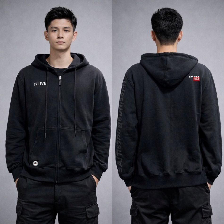 這套 17LIVE 公司制服走「黑得很有秩序」路線:健康布拉鏈帽T 一穿就整齊,拉鍊方便分層,帽型與下擺更有包覆感。 正面胸口識別乾淨俐落,背面與袖側配置讓辨識度不需要靠大面積字。做成團體服、團體制服很穩,制服訂做也能兼顧耐穿與日常感。
