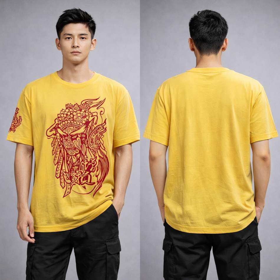 這件純棉新莊廟街圓領 T 恤走的是一眼就有記憶點的路線:亮黃色底搭配大面積紅色圖騰,整體很有廟街文化氣息,也很適合活動現場與人群辨識。 純棉穿感自然、親膚不刺,前面主視覺夠強,背面留白乾淨,做成團體服、團體制服或制服訂做都很有主題性。