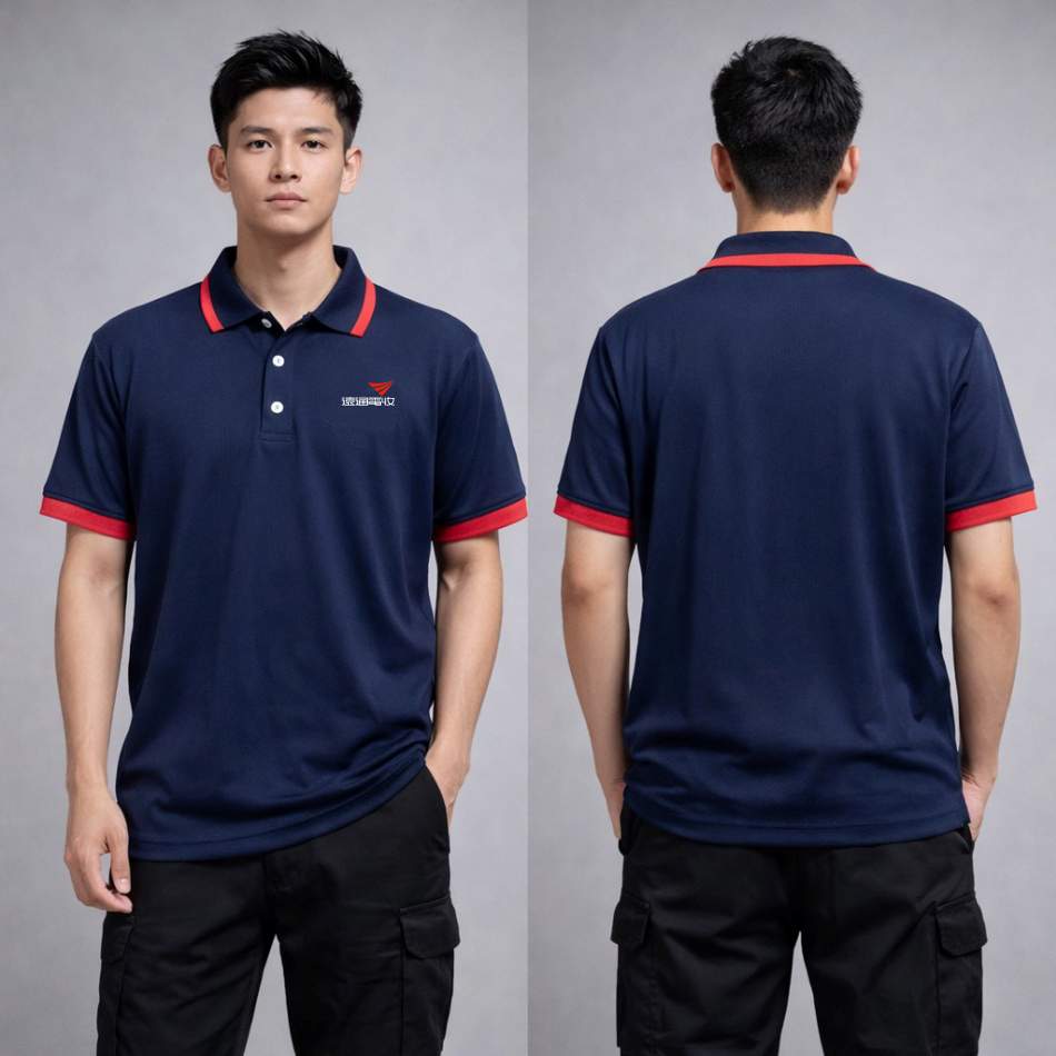 排汗 POLO 衫|正反面展示|深藍主體 × 紅色領袖滾邊